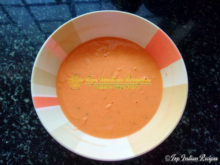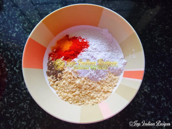 Take a bowl mix together 1 cup gram flour, 1/2 cup rice flour, 1 tbsp red chilli powder, 1 tsp cumin seeds, a pinch of turmeric powder, salt to taste and water together into a smooth batter.