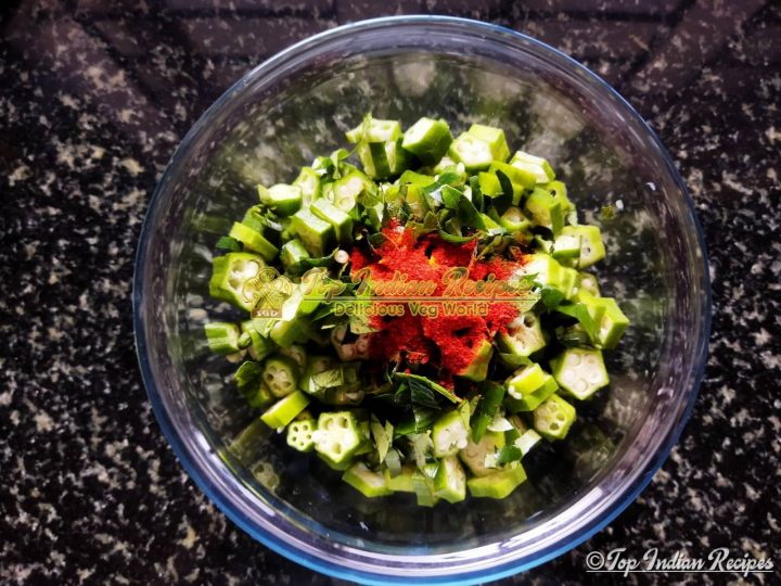 Combine all the ingredients well, squeeze the bhindi well to release moisture and make dough moist. (If you feel the dough is too dry, sprinkle just a few drops of water)