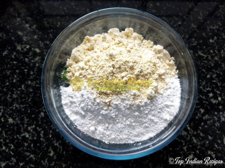 Then add ¾ cup besan or gram flour, ¼ cup rice flour and salt to taste.