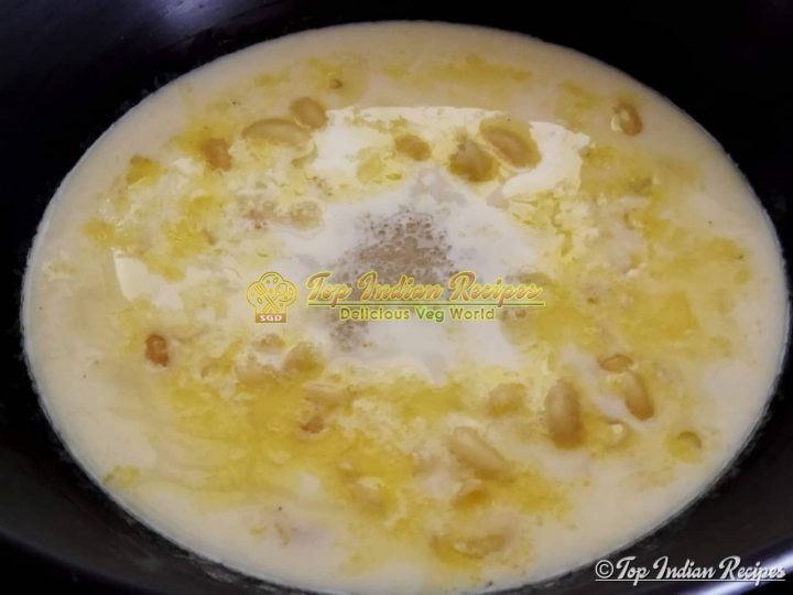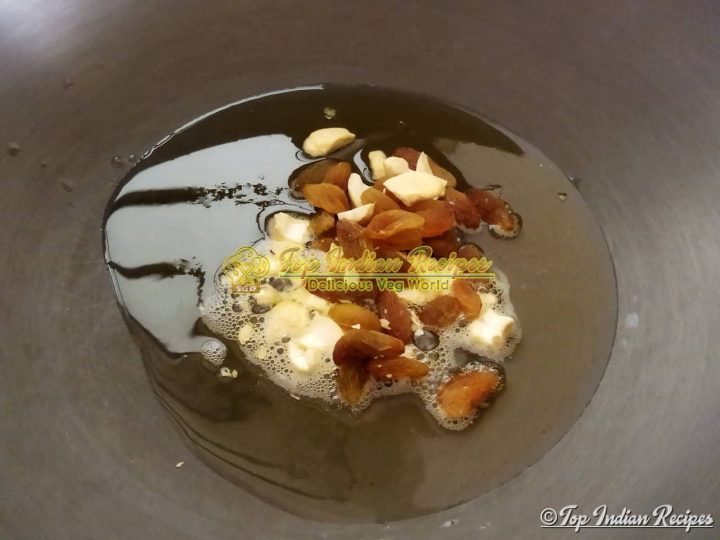 In a heavy bottomed pan add ghee and when ghee is hot add cashews and raisins, sauté the causes till they change golden brown.. Keep aside.