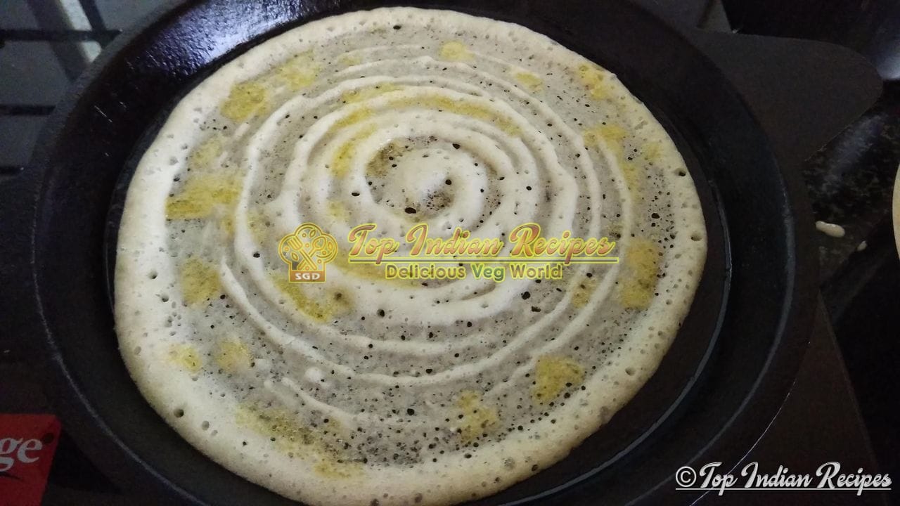 Add a ladleful batter in the center of the pan and spreading in circular motion, form a flat round and cover with a lid. Let cook for a few seconds. Add a few drops of oil or ghee if you wish.