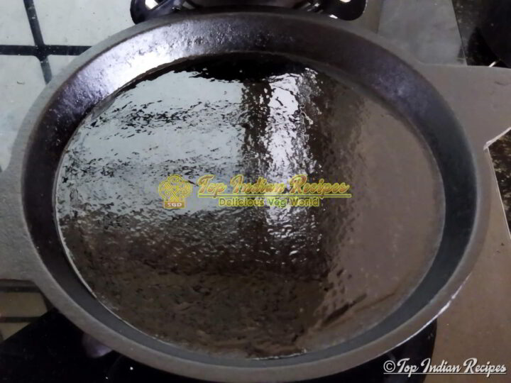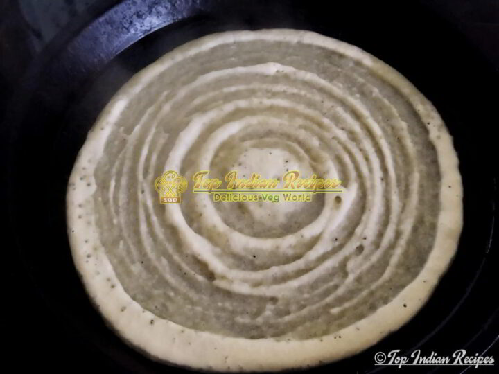 Pour a ladle of dosa batter in the center. Spread the batter from the center in a circular motion to make a circle.