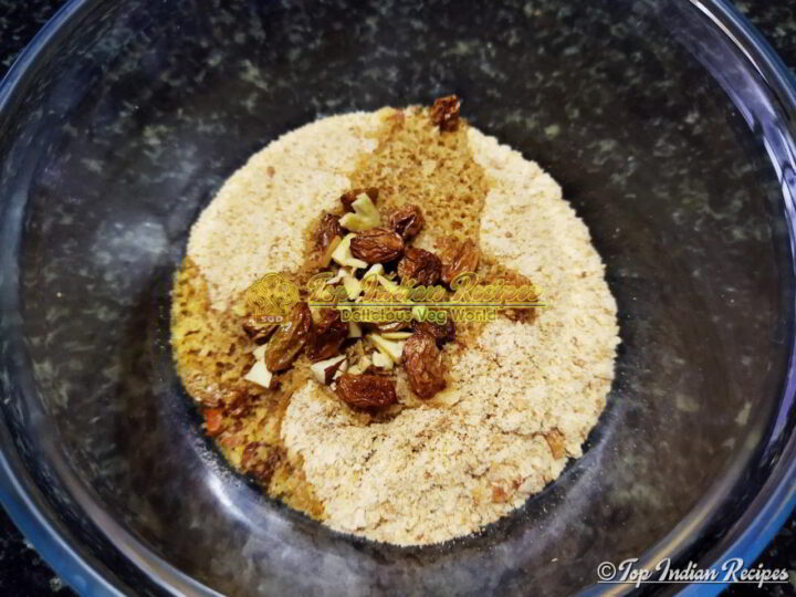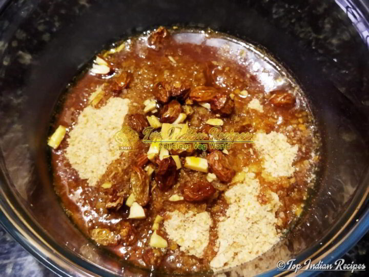 Take a small pan heat 2 tbsp ghee, add few raisins, few chopped cashew and few chopped almond and fry on low flame until it turns golden brown.